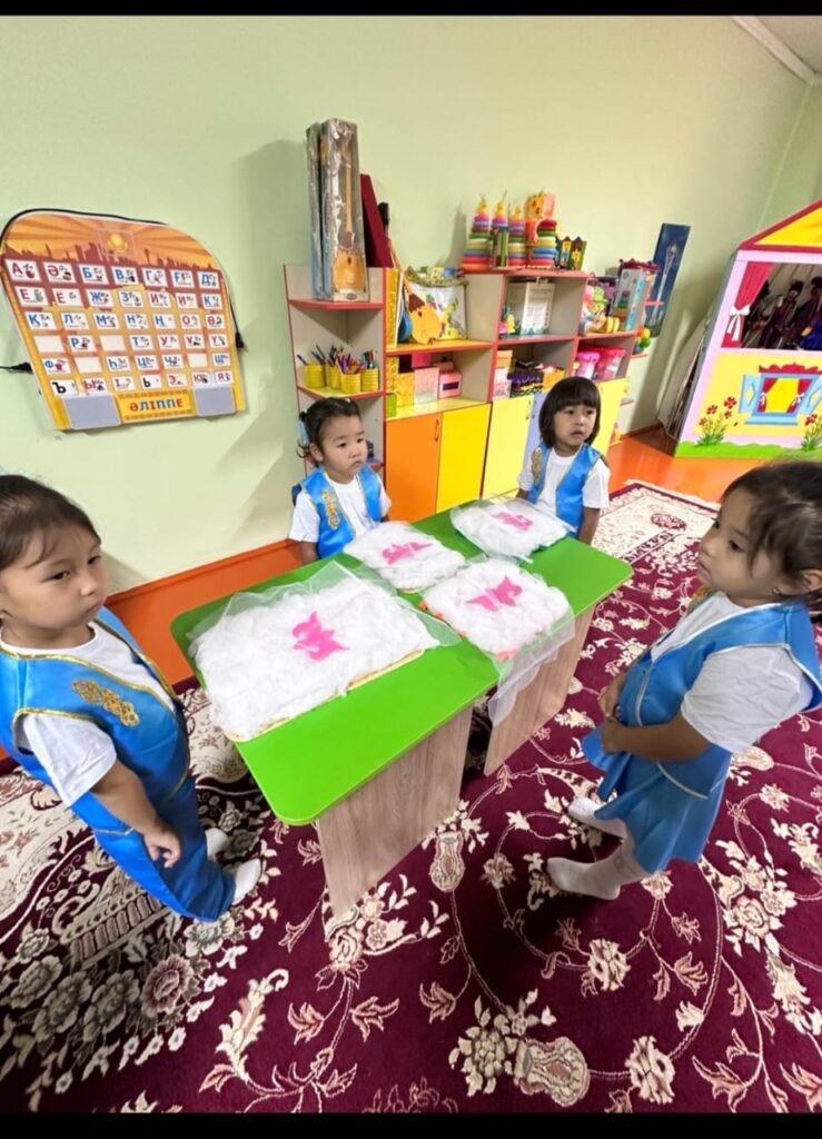 Іс- әрекет барысында тәрбиеленушілерге ою құрастыру, түстерді үйлестіру және өз қиялымен өрнек бейнесін жасау тапсырмалары ұсынылып, балалардың шығармашылық қабілеттері мен ұсақ моторикасын дамытуға жағдай жасалды. Топ тәрбиеленушілері белсенділік танытып, ұлттық өнерге деген сүйіспеншілігін көрсетті.